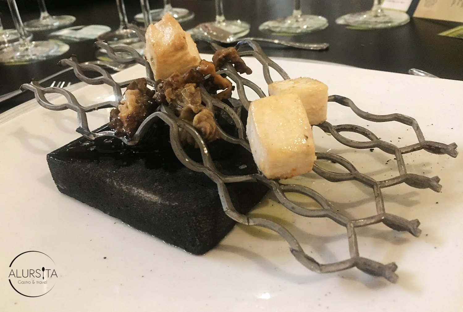 El primer plato fuerte que probamos fue un risotto de anguila ahumada espolvorado en mesa con queso parmesano y almendra, maridado con Ghost Pines Zinfandel, San Joaquin, Sonoma & Lake County, con una uva icono de California, muy expresiva, con muchos arándanos, frambuesas, pimienta, clavo y roble tostado, así como con mucho tanino y un poco de acidez. Un vino muy expresivo. Fue muy interesante este maridaje, ya que al mezclarlo con el plato se exaltaba el sabor a anguila y el plato se volvía completamente balanceado.