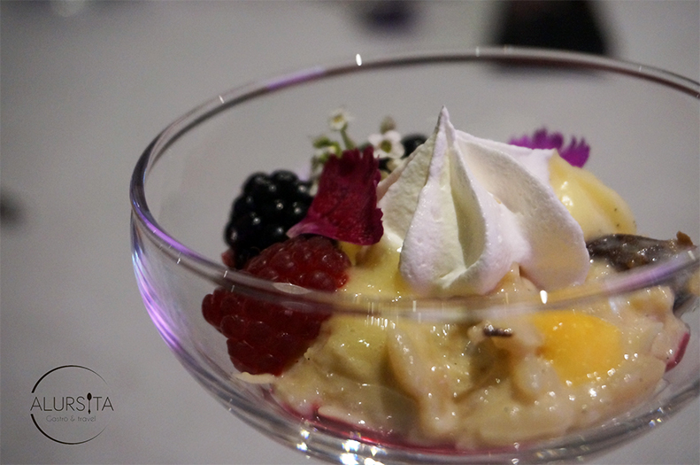 ¿Qué te parece un risotto de coco con piña? Es un singular postre de frutas de temporada, nuez, almendra, piñón, rosa, natas y bombones de pastelera, piña y coco.