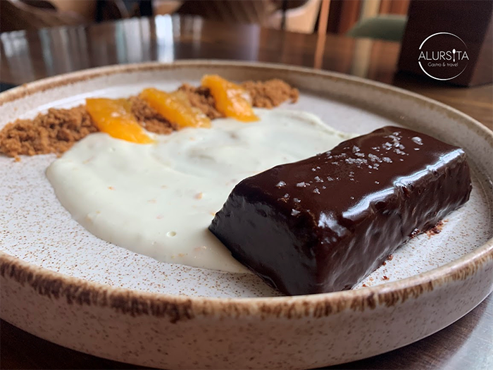 De postre degusté un pastel sin harina con cacao, servido junto a un espejo de crema de Xtabentún, con una línea paralela de crumble de pimienta tabasco y unas supremas de naranja, decorado con sal de mar.