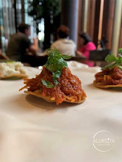 En esta ocasión, mi degustación comenzó con el platillo de “tostadas de mentiras”; un plato sumamente creativo que hace volar tu imaginación, sin saber muy bien lo que comes hasta que te explican los ingredientes. Una de las tostadas es de coco tierno que simula ser pata de cerdo en escabeche y la otra de coco maduro que simula tinga. Ambas tostadas te dejan con la boca abierta al descubrir que ninguna tiene procedencia animal y te logran desconectar de tu vida diaria.