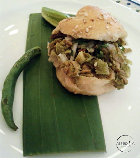 Primer tiempo: cemita de pancita de res cocida al vapor con pulque, jalapeño y epazote. Un toque distinto en la tradicional cemita poblana, con cebolla, cilantro, limón y chile toreado. Esta vez con Vino Gaby Rosé Syrah Grenach frío, suave y afrutado para balancear los sabores.