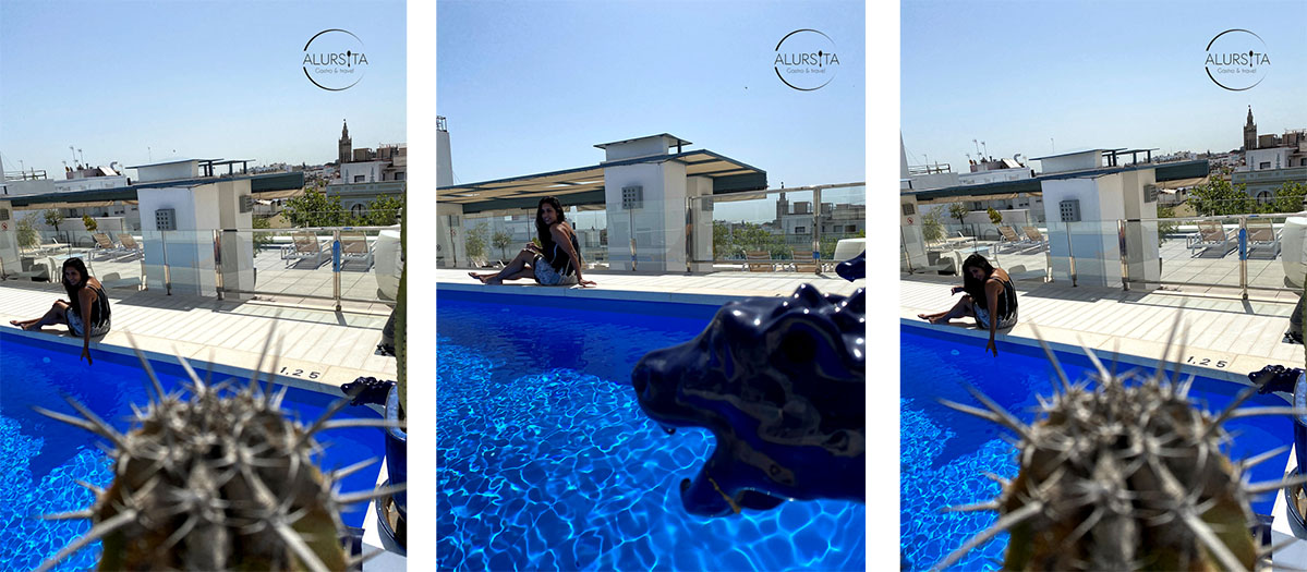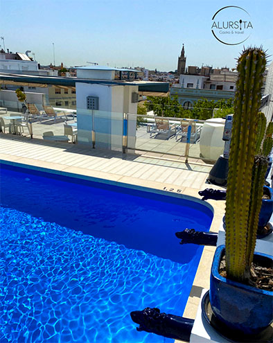 Edificado sobre una de las antiguas casas de la famosa calle Reyes Católicos de Sevilla, el Hotel Bécquer cuenta con cómodas y variadas habitaciones, piscina, restaurante y terraza con unas magníficas vistas a la Catedral de Sevilla. Me tocó disfrutar de un hermoso atardecer, tumbada en una hamaca junto a la piscina, y observando como el sol se escondía y la torre de la Giralda, simplemente espectacular.