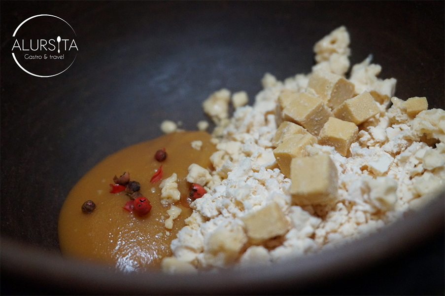 A continuación, llego el quinto tiempo, un arroz basmati “a la tumbada” un platillo tradicional del estado de Veracruz, específicamente de la costa de Alvarado. Preparado con una salsa a base de chile mulato, chile costeño, camarón, tortilla pochada, ajo, cebolla y tomates. Sobre el arroz se sirve esferas de cebolla, cebollín, perejil, espuma de coco con arroz y se acompaña con Lobina rayada marinada en lías de sake.