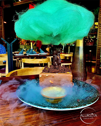 Todo un espectáculo llega a la mesa con el postre que elegí, “El Bonsai”. Literal, es un arbolito bonsai de chocolate formado con financier de avellana y chocolate al 70% cacao infusionado con naranja, crema de Bailey´s y como follaje un algodón de azúcar infusionado con albahaca. No es mi primera ocasión que visito este restaurante, y tiene una cosa que me encanta, y es el sabor agridulce de mucho de sus platillos…lo amo