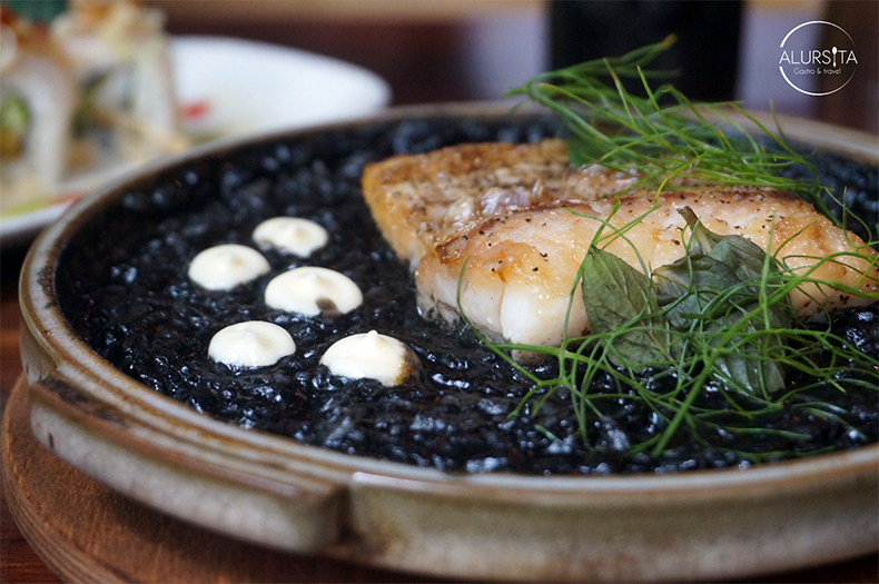 Continuamos con un huachinango a la plancha sobre una cama de arroz negro preparado con tinta de calamar y fondo de pescado, adornado con un alioli de ajo blanco.