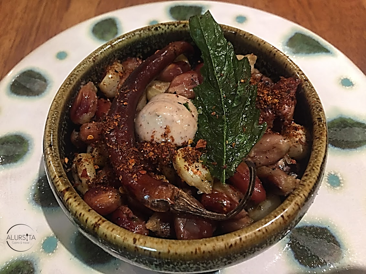 Como primer tiempo probamos los esquites ancestrales. Éstos están elaborados con maíz rojo, azul y blanco, especies endémicas de Pátzcuaro, sazonados con tequexquite, epazote, cebolla y una mayonesa con polvo de chapulines hecha en casa. Es asombroso como, al usar un maíz no tradicional, el sabor del plato cambia completamente a lo que nuestra mente recuerda.