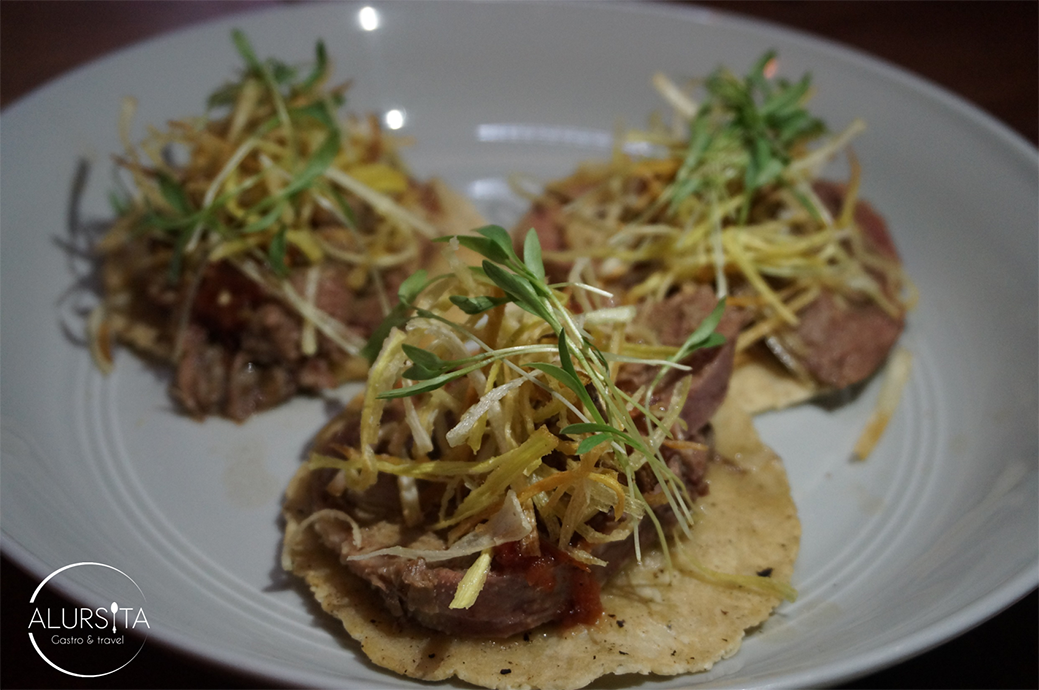 De primer tiempo, disfrute de unos tacos de laminas gruesas de lengua de res en tortillas recién hechas, acompañados de una guarnición de poro frito, salsa mortajada y brotes de cilantro. Para lograr la suavidad de la carne, que se valora mucho en este tipo de platillos, la lengua tuvo una cocción de 8 horas. La búsqueda de este plato es poder capturar un poco de la esencia de la comida callejera de la Ciudad. A mi parecer, logran hacer un muy buen trabajo, convirtiéndose por lo tanto, en una magnífica opción para muchos que buscan estos clásicos en restaurantes.