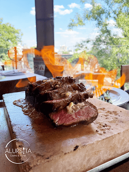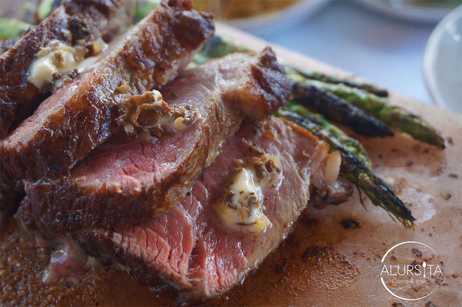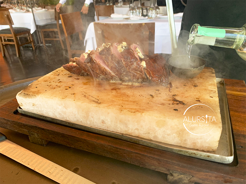 Como plato principal elegimos una caña de Rib Eye de 600gr al mezcal servida sobre un bloque de sal. Para presentarla, hace un servicio de gueridón frente a la mesa, donde terminan de cocerla. La engrasan con mantequilla a las finas hierbas y terminan flameándola con mezcal Unión. Como guarnición elegimos unos espárragos al carbón y una torre de papas trufadas con queso parmesano y aceite de trufa.