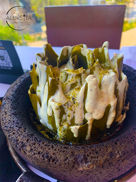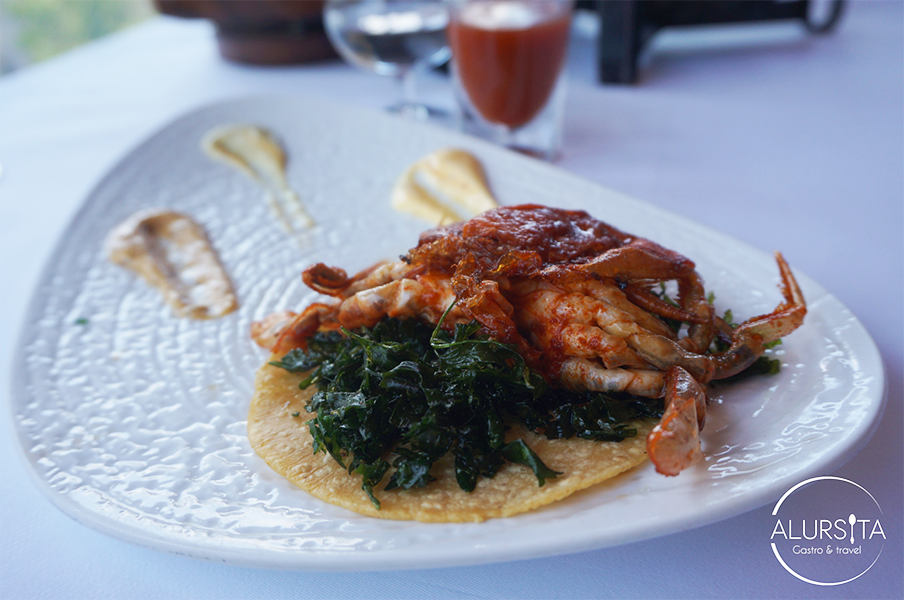 En esta última visita comenzamos con tres entradas, unos sopecitos de tuétano y escamoles, alcachofa al piquín, una alcachofa terminándose de cocer en la mesa sobre un molcajete con aderezo de la casa con finas hierba, queso fresco y jocoque, y unos tacos de jaiba desnuda, una jaiba azul de concha suave adobada sobre una tortilla de maíz, acompañada de perejil frito, servida con pincelazos de tres aliolis: serrano con cacahuate tatemado, zanahoria con habanero y el último, de chile de árbol y morita.